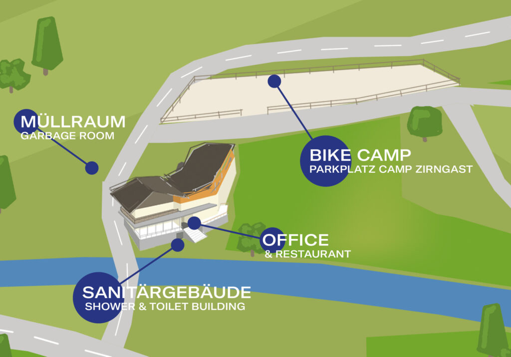 - Anmeldung im Camping Office notwendig (Aushändigung der Zugangskarte für den Sanitärbereich)